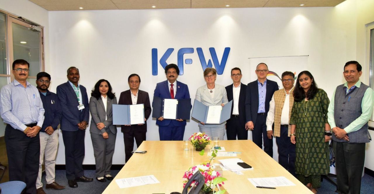 The agreement was signed by Carolin Gassner and Frank Bohnet on behalf of KfW. Officials including Rukmini Parthasarathy, Deputy Director at KfW New Delhi, and Ramana Reddy were present, with additional participants joining virtually.